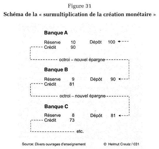 Dans le schéma de Creutz, ces 90 aboutissent sur un compte dans une banque B. Celle ci va pouvoir à son tour émettre un nouveau crédit de 81 qui partira vers une banque C. Mais ces montant s’jouteront effectivement les uns aux autres car aucun dépôt à vue n’a été ponctionné pour le prêter à un autre client. C’est simplement parce que ces auteurs considèrent que, contrairement à ce que les « créationnistes » (comme ils nous appellent) expliquent, les banques ne peuvent monétiser des créances (créer « leur » monnaie sous forme de reconnaissance de dette du bénéficiaire) et n’ont qu’un rôle d’intermédiaire d’une monnaie toujours prééxistante.