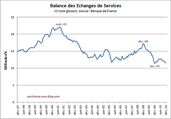 La balance des échanges de service est étroitement liée au secteur tertiaire et ne montre plus qu’un un excédent en baisse à +11,5 milliards d’euros sur un an :