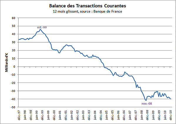 La balance des transactions courantes retrouve presque son plus bas de 2008, à -40 milliards d’euros sur un an :