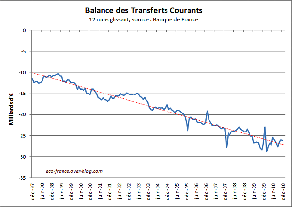 4 – La balance des transferts courants: l’argent continue de sortir du pays, avec -26 milliards d’euros sur un an pour la balance des transferts courants :