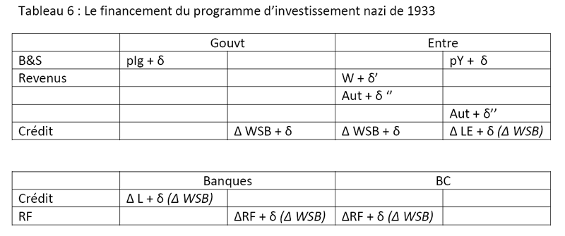 Il y a eu, d’une part, à l’étape 2 création de monnaie scripturale lorsque les banques ont fait crédit aux entreprises et, d’autre part, création de monnaie banque centrale à travers le refinancement à l’étape 3. Le mécanisme basé sur l’émission par l’Etat de ces bons d’offre de travail (WSB) a été d’une grande efficacité car il reposait sur des investissements publics et la fabrication en grande série de biens d’un type particulier (de l’armement mais pas uniquement) que l’appareil productif allemand pouvait produire.