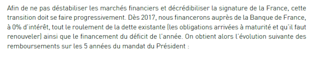 Je ne vais surement pas me plaindre qu’enfin Nicolas Dupont-Aignan ait intégré dans son projet présidentiel la nécessité – mon insistance depuis plusieurs années sur ce sujet semble avoir porté ses fruits – d’une part du rachat par la Banque de France des titres de dette arrivant à échéance, d’autre part du financement (monétisation) des déficits.
