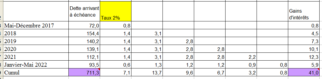 En estimant que les taux d’intérêts moyens soient de 2% c’est 41 milliards.
