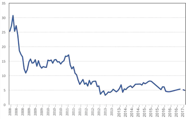 Le cours de la tonne de carbone dans l’UE (2008-2017).