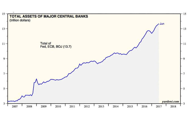 Rien, en effet, n’exprime mieux la faillite de la gouvernance mondiale que d’avoir abandonné la gestion des conséquences de la crise à ceux qui avaient contribué à en créer les conditions par une politique monétaire systématiquement biaisée en faveur de l’injection de monnaie. « Apprentis sorciers », les dirigeants des principales banques centrales, à commencer par la Réserve fédérale des États-Unis, apparaissent surtout comme des pompiers pyromanes. Leur réponse à la crise d’un modèle de croissance fondé sur l’endettement exponentiel des principaux agents économiques, publics et privés, aura été de doubler ou tripler la mise, les prétendus « gardiens de la monnaie » transformant en quelques années les bilans de leurs vénérables institutions en gigantesques fonds spéculatifs, gorgés d’actifs de qualité souvent douteuse (voir graphique ci-dessous). De 2007 à 2017, les actifs des banques centrales des pays du G7 ont bondi de 3 000 à près de 15 000 milliards de dollars. « La dimension de la bulle créée par la politique de taux d’intérêts négatifs et d’assouplissement quantitatif a conduit Bill Gross à comparer la situation financière actuelle à l’émergence d’une supernova, l’explosion massive qui se produit à la fin du cycle de vie d’une étoile », écrivent les auteurs.