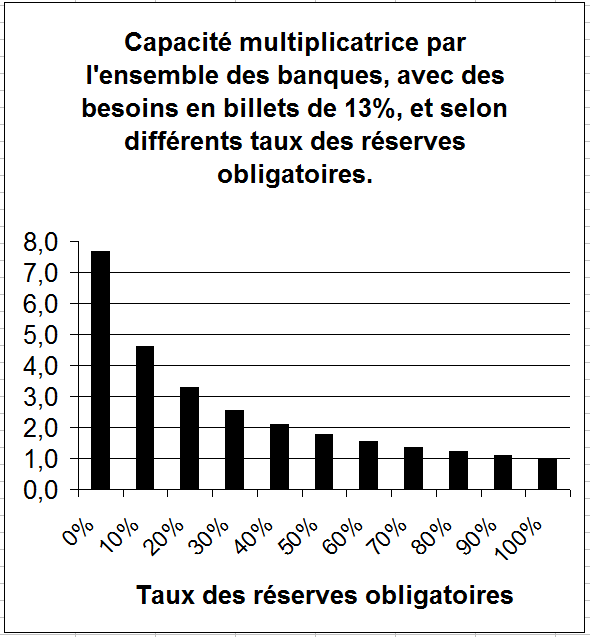 Dans une hypothèse où le taux de réserves obligatoire serait de 2% et où la préférence pour les billets diminuerait à 2%, la capacité de création monétaire de crédit de l’ensemble du système bancaire dépasserait un K = 25 ; ce serait dans ce cas la limitation des fonds propres – devant être supérieurs à 8% des crédits – qui interviendrait probablement bien avant que ce chiffre ne soit atteint)